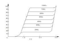 离子流氧分析仪传感器在不同氧浓度环境气体中,电压电流特性如下图所示: